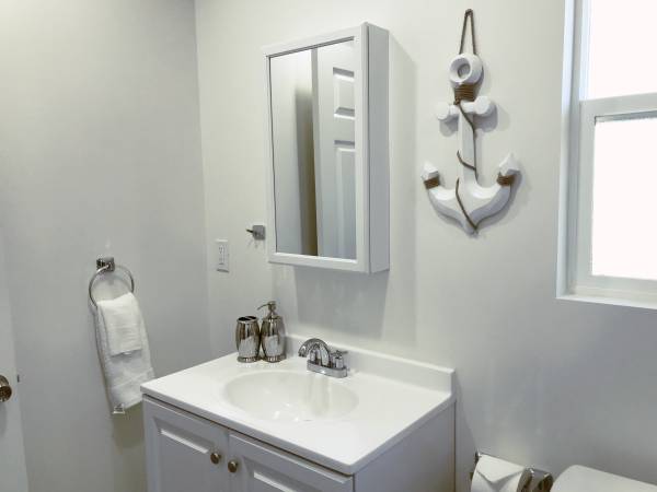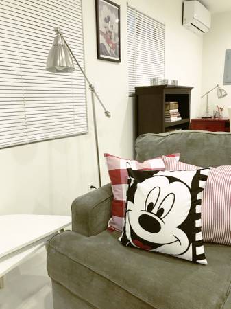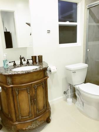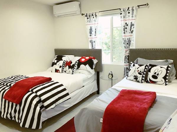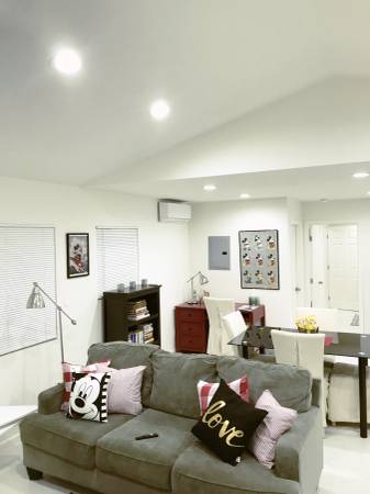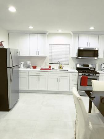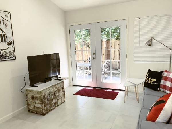 Newly built house with open plan living space. Living area has french doors that open to a private yard. This home has high ceilings, designer floor tiles, plentiful windows and a modern cook's kitchen with quartz counters and stainless-steel appliances. Fully furnished with giant smart TV, hi-speed internet and wifi. This is 900 square feet of space, economically priced for maximum enjoyment.