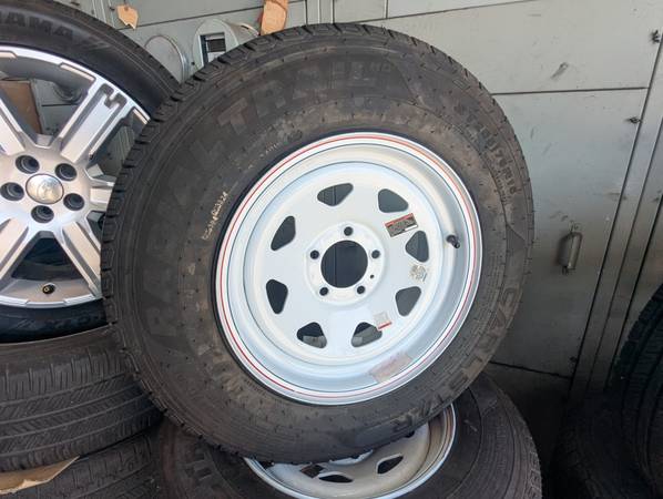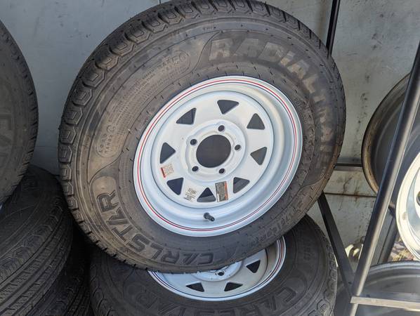 BRAND NEW 205-75-15 CARLSTAR ST RADIAL TRAIL HD TRAILER TIRES, MOUNTED ON BRAND NEW 5X4.5" STEEL WHEELS, SETS OF 4, $150 EACH TIRE AND WHEEL, READY TO INSTALL, WILL FIT BOAT TRAILERS, JET SKIS, ETC, LIMITED SUPPLY AT THIS PRICE, *THESE TIRES MAY SELL WHILE THE AD IS STILL UP. PLEASE CALL THE SHOP FOR AVAILABILITY. LOWEST PRICES AROUND, LARGE SELECTION OF NEW AND USED TIRES IN STOCK, TIRES BY STAN IN VAN NUYS, 7740 SEPULVEDA BLVD, BETWEEN STAGG and SATICOY. OPEN 7 DAYS MON - FRI 8 am to 6 pm, SAT 8 am - 5 pm, SUN 8 am - 4 pm, CALL STAN @ (818) 782-8284