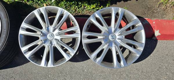 Set of 4 OEM Wheels off 2009 Hyundai Genesis. 2 have tires on them with good tread. 1 is a PZero Nero by Pirelli. Way below what dealer cost would be. First come with cash gets them.