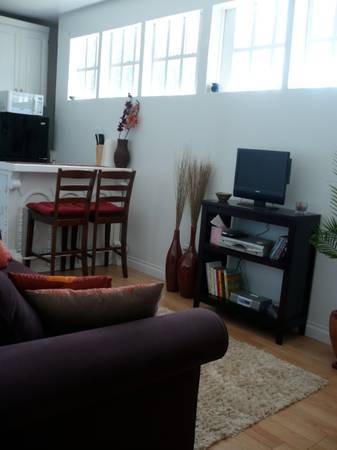 The cottage features , , , Cozy Living room: Bedroom with mirrored closet: Kitchenette with stainless steal stove and fridge, and tiled island separating it from the living room space: Small study/storage room: The study/storage room can not fit an extra bed but is large enough for a computer desk. Bathroom: Air conditioning and ceiling fans: Wireless Internet: Laundry Facilities: Large front and back yards with beautiful gardens, fruit trees, flowers, park benches, gazebo, and sun room: Plenty of unlimited, nonrestrictive street parking: