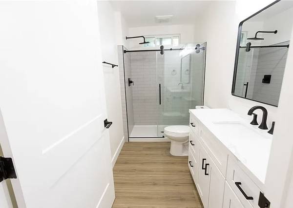 Single story two bedroom and one bathroom ADU in quiet Glendora neighborhood. Very private and secluded with private gate and walkway leading to ADU. Two parking spaces. Open family room and kitchen with white cabinets, quartz counters, and stainless appliances including electric range, dishwasher, and refrigerator. Stackable washer and dryer. Two bedrooms with mirror closets and hallway bathroom with vanity with quartz counters and large shower. Laminate flooring and recessed lighting thru-out. Small patio area and two parking spaces.