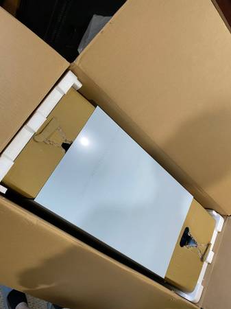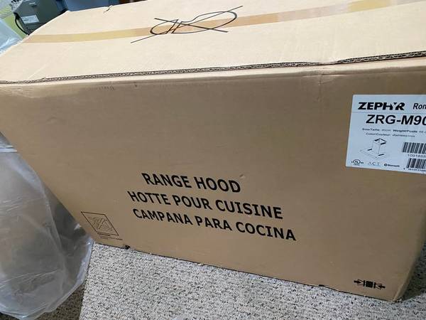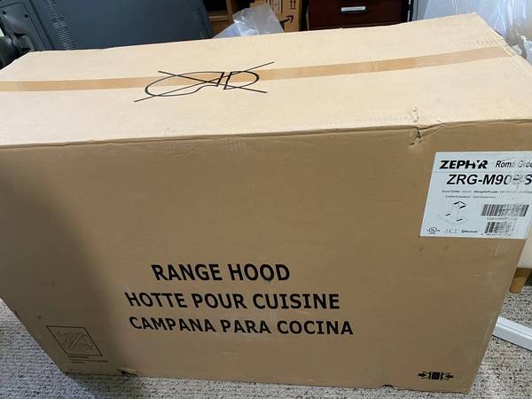 Open box of the Zephyr Roma Groove 600 CFM 36 Inch wall mounted range hood. The model itself is the bluetooth variant and has speakers built in to the hood.