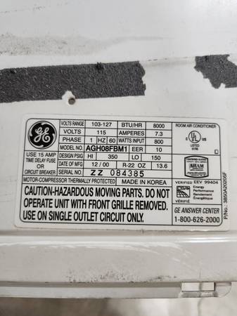 YOU ARE LOOKING AT A VERY GOOD CONDITION GE APPLIANCE ROOM/WINDOW AIR CONDITIONER 8,000 BTU. 800WATTS. (MODEL NO. AGH08FBM1). IT STILL BLOWING COLD AIR, NO LEAKS, I CAN TURN IT ON FOR YOU TO SEE. PLEASE LOOK AT ALL THE PICTURES. WORKS 100%.