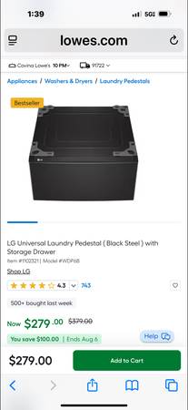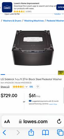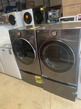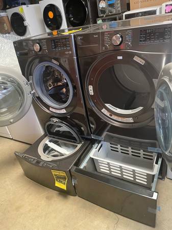 set Front Load Washer 5.0 cu ft and gas dryer 7.4 cu ft steam LG black stainless steel w 27” include the pedestal