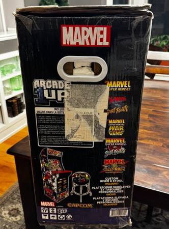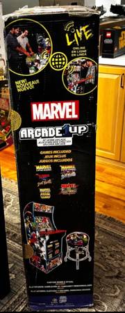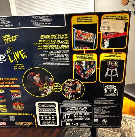 Brand New/Factory Sealed Box Arcade1Up Marvel vs Capcom Arcade 5 Games In 1, With Riser/ Stool. Perfect for a living room, man cave or game room! With the holidays right around the corner, this would make someone’s day. This is a 2 player model. The great thing about this machine is that it includes 5 games in 1 cabinet! Includes riser and stool in box.