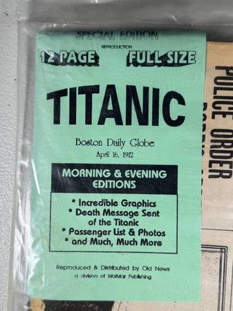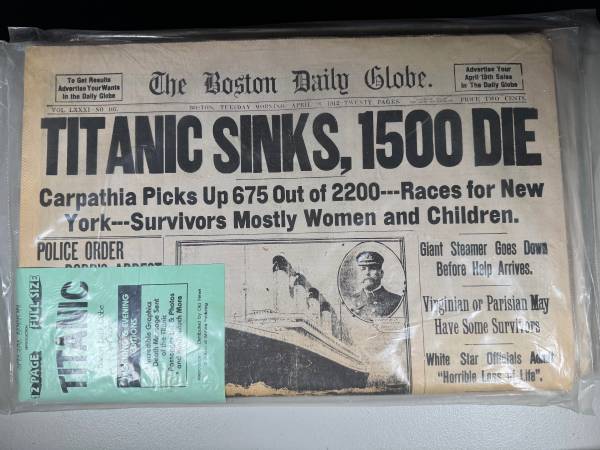 The product is a reprint of the Boston Daily Globe from April 15, 1912, announcing the sinking of the Titanic. This historical document provides a first-hand account of the tragic event and offers a unique perspective on the aftermath of the disaster. The reprint serves as a valuable collectible for those interested in maritime history and the Titanic tragedy, offering a glimpse into the impact of the event on society at the time.