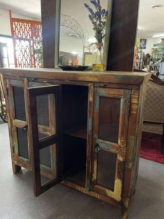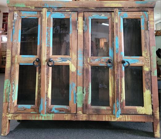 4 door cabinet Beachy vibe Rustic Iron Door hardware Buffet Bar Quilt cabinet Display cabinet Handcrafted Recycled Wood A VINTAGE WALK Open: 10am - 2pm Weds through Sunday