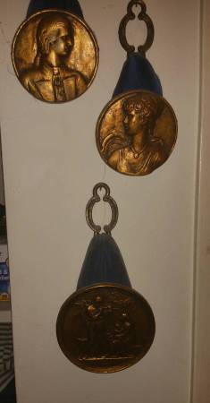 Vintage Mid Century MCM / Hollywood Regency Medallions / Coins Gold / Bronze Color Made of plaster Look like coins Set of 3 Two are 4" across One is 5" across Prefer email or text messages, no...