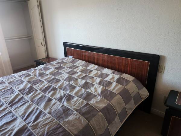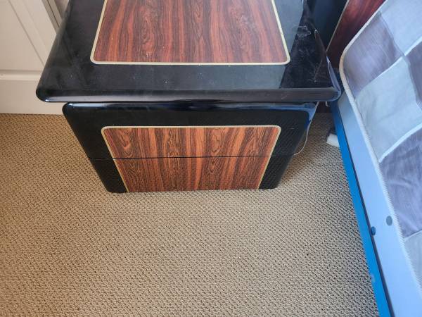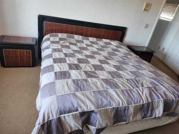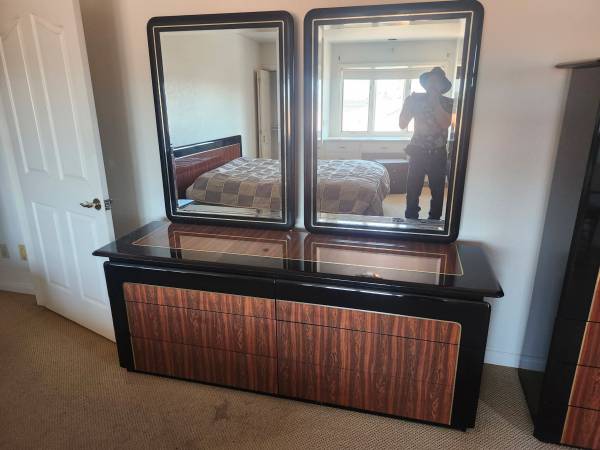 Beautiful 1970s Black Lacquer Queen Bedroom Set. Black Mirror Mirror wall set End Tables Headboard Dresser with Mirror Armoire In good condition. We'll deliver for small fee
