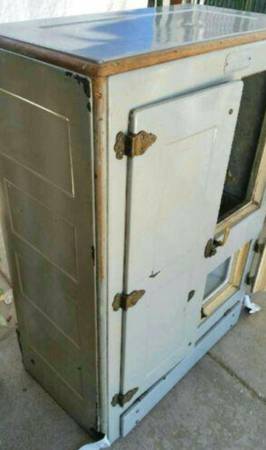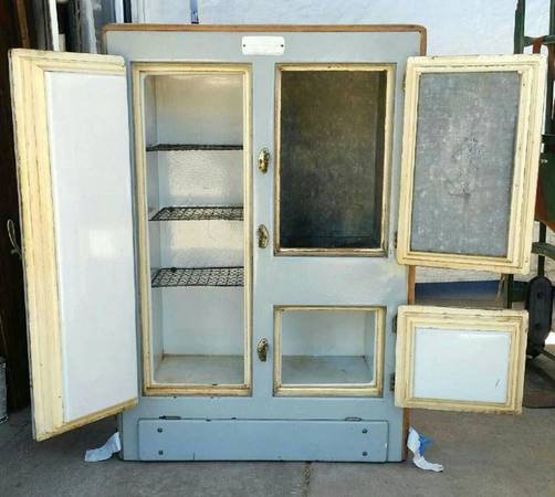 Antique Bohn company icebox circa 1906. In good condition with normal wear for its antique age. Completely original and heavy duty. Made of metal with gray porcelain enamel, maple wood slatted back, maple trim, brass hardware handles. Heavy duty. Very rare! Over 100 year old antique great conversation statement piece! This predates the electric refrigerator. Frozen dry ice blocks were actually used inside to keep food fresh. Measures 47" h x 19" d x 32.5" w. Located in the LA Alhambra border area 90032.