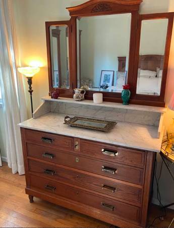 Vanity could be used as an entry piece or dining room sideboard. Mirror separates from base for moving, leaves can be flat or folded inward. Marble is in good condition, no stains, chips or cracks. Length 47.5" depth 20"