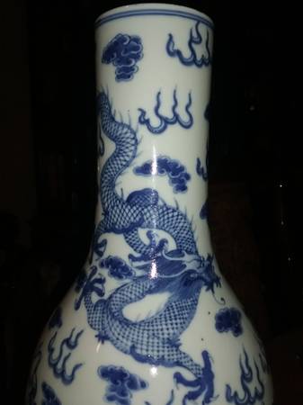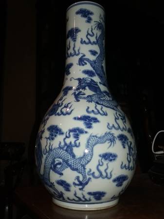 Estate Tall ( 16") antique chinese blue and white porcelain tianqiuping celestial sphere form vase with dragons. Exceptionally fine detailed vase dates from 1644 - 1732 making this from 300-400 years old.