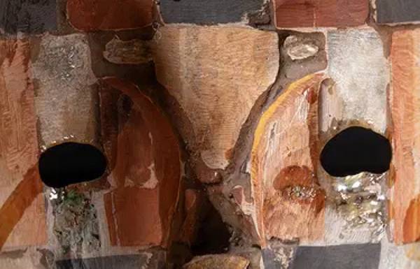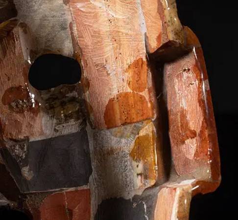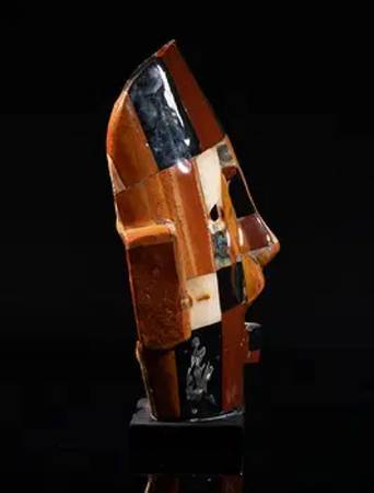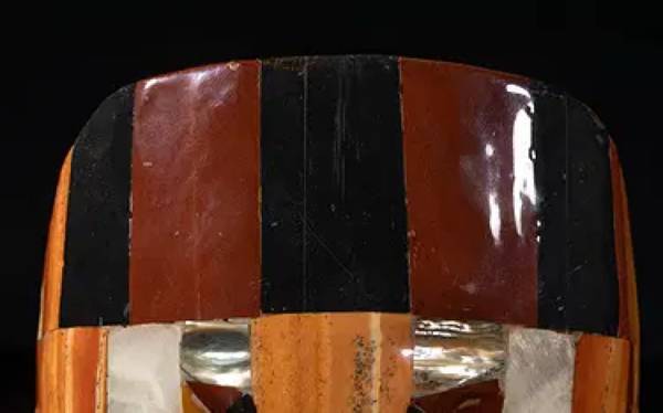 Vintage Mexican Aztec mask sculpture decorated with gemstone, with stand. Approx. 7.8*6.2*3 inch (mask size w/o stand).