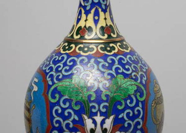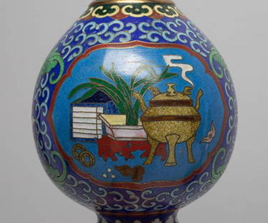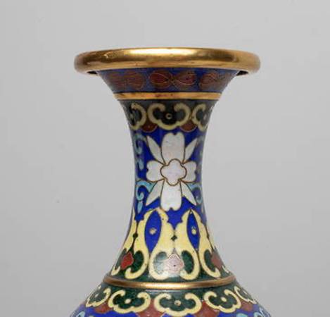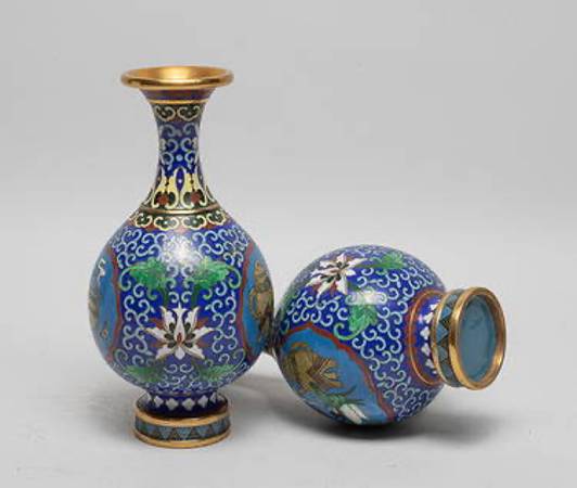 Each of pear shape rising from a splayed foot to a waisted neck with a flared rim, enameled with two ruyi-head shaped medallions of scholar bogu pattern, against deep blue background suffused with lotus scrolls. Approx. 7.2*3.6 inch (each).