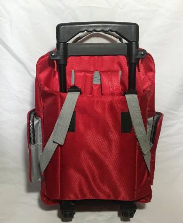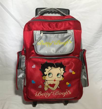 Betty Boop Rolling Backpack. Has a retractable pull handle, two side pockets, two front pockets and the main compartment. Approx. 20” H x 15”W Has some imperfections from love and wear, see pictures.