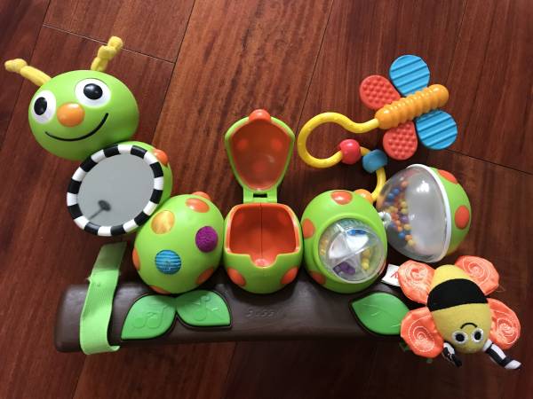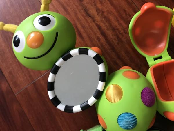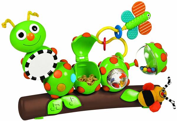 Izzy Inchworm Interactive Stroller Toy has over ten activities to keep baby entertained including melodies and silly sounds, baby safe mirror, snack cup with lid, colorful rotating dial, spinning butterfly with bead chase, teethable butterfly wings, multiple textures, rattles and much more. It has an adjustable, elastic strap for easy stroller attachment.