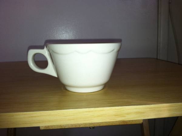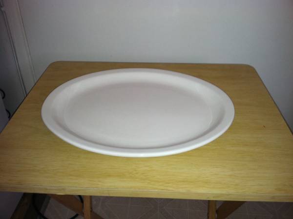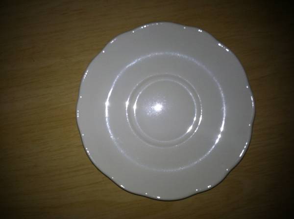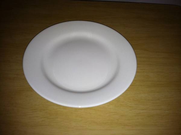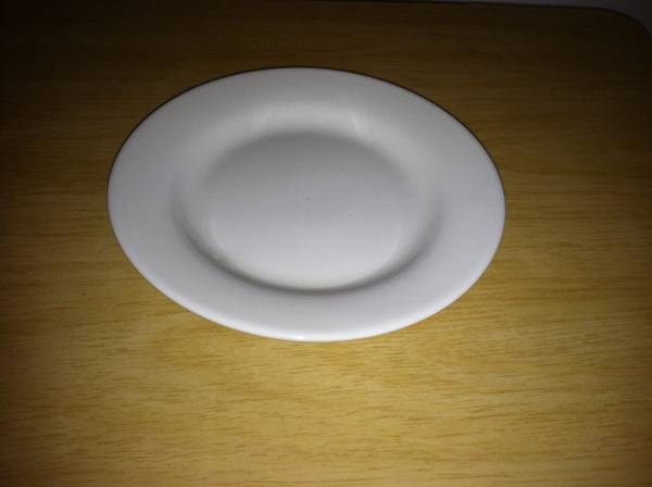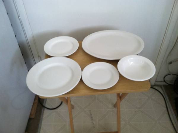 Bright white casual porcelana dinnerware. fruit bowl, salad plate, dinner plate, oval platter, cups, saucer, ramekins, 10 3/4" plate $ 2.00 each, 6 1/2" plate $ 1.00 each. fruit bowl $ 1.99 each call