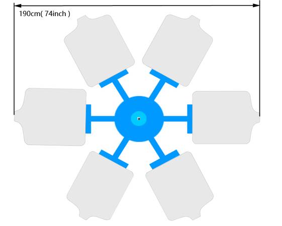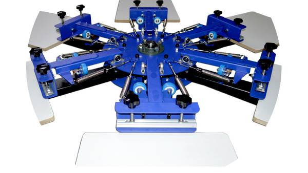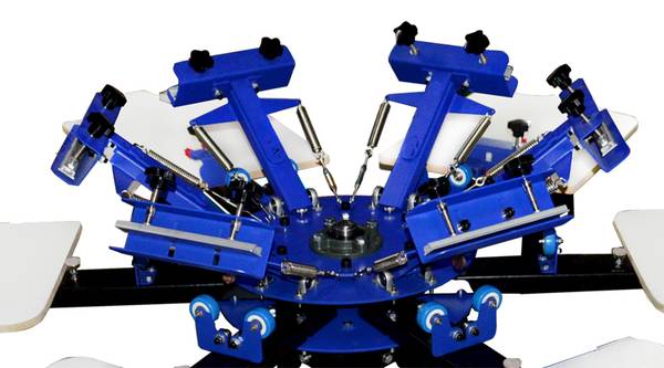 This is a simple type 6 Color 6 Station Screen Printing Press. It can apply 6 screens to 6 stations simultaneously. The the screen layer and the pallet layer can rotate independently, which makes it easier for multi-color printing.