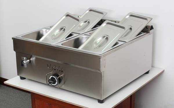 This exciting new bain-marie is constructed with very thick high quality stainless steel . It provides high-efficiency performance and is equipped with a thermostat for easy temperature control. They are extremely easy to use and very reliable. It has 4 wells and will hold 4 half size pans, 4" deep. In fact this buffet warmer is ideal for restaurants, hotels, banquet halls and cafeterias but will still work great around the home or for catering purposes with gas.