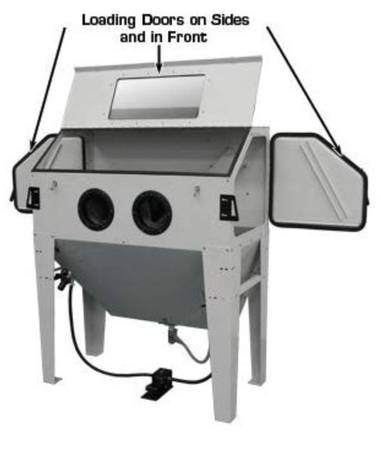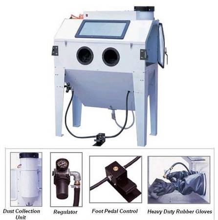 Sand blaster Upright heavy industrial workshop floor model. Heavy duty steel construction. This 420 litre capacity cabinet is fitted with heavy duty pvc lined work gloves, sandblasting hose & trigger lever sandblasting gun. Includes replacement ceramic & steel tips.