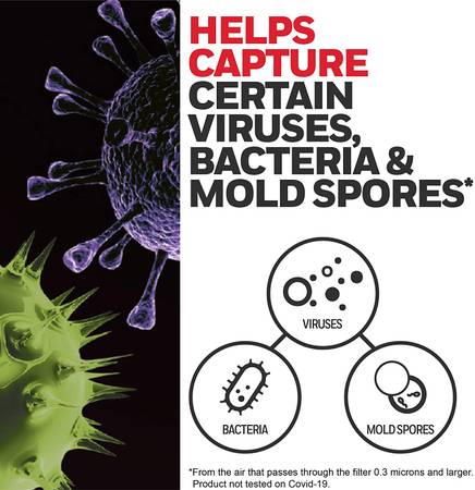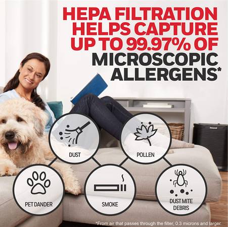 Purifier captures up to 99.97% of airborne particles as small as 0.3 microns, including bacteria, allergens, mold, pollen, smoke, dander and dust.