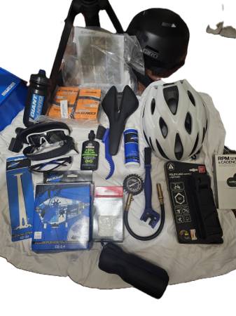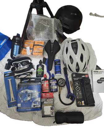 Extras included: 2 helmets, GPS, cadence sensor, lights (front & rear), extra seat, bike stand, and more — over $6,500 total value