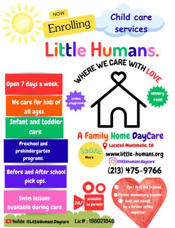 Or visit our website www.little-humans.org or contact us at (213)475-9766. We offer around the clock care 7 days a week. We accept children of all ages and provide all forms of care designed and tailored for the children to support the working parents. We thought of it all come check us out while space is available. We aren’t your normal day care we have 24 hour surveillance, certified swim lessons by licensed instructors and top curriculum to all ages. Reach out and schedule a tour or give us call we are always available. We are not your average day care we are high quality service always available.