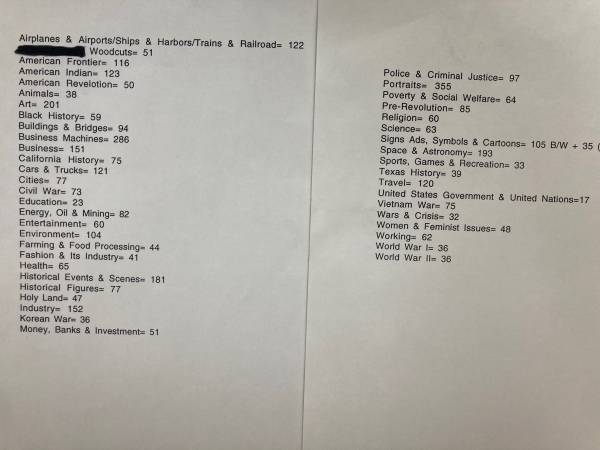 Cars, American Frontier, Farming, Black History, Labor, WWI, WWII, Korean War, Vietnam War, Historical Figures, U.S Government, Buildings, Space/NASA, California History, Aircraft, American Indian, Women in War, American Revolution, Civil War, Energy.