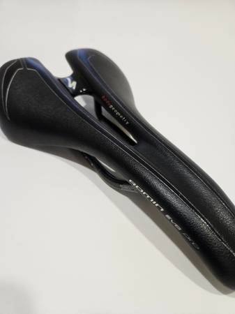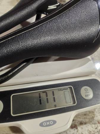 Very comfortable saddle with carbon rails. 155mm wide, which is similar to a 143 in other saddles. 171 grams. It has a tear on one side from a crash, but it's really just cosmetic. You need to use seat post clamps that fit carbon-rail saddles. Contact Ashley at 626-319-75-three-six.