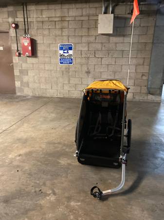 Burley Bee Double Yellow bike trailer, including hitch, flag, and all other parts. In great condition, my kids have outgrown it. $250 or best offer.