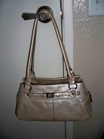 Selling a Giani Bernini Satchel Handbag / purse with multiple compartments for $12. It is cream color (P. OYSTER) glazed leather with silver hardware, and is from Macy's. It is in excellent "very...