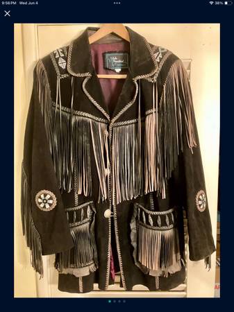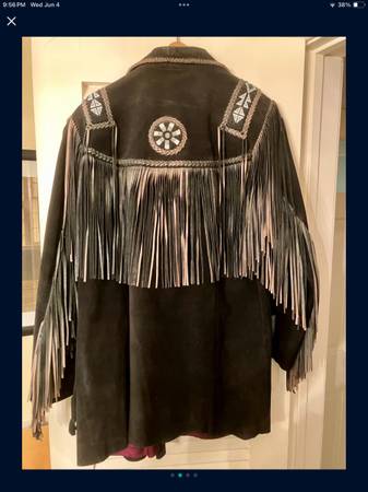 Echo Mountain by Arturo black suede jacket with fringe and beaded embroidery. Fully lined with one interior breast pocket. No rips or tears or scuffs or frayed stitches. Men’s size 38.