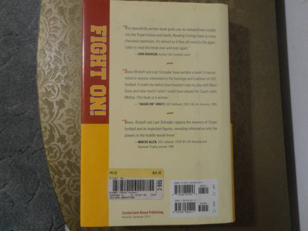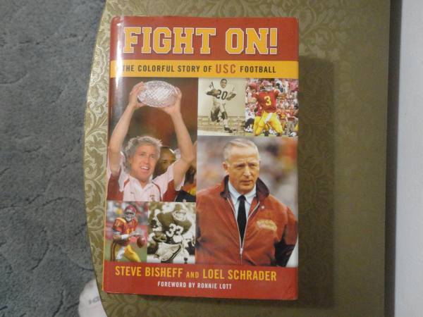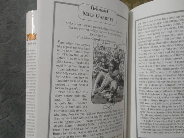 A hard cover book titled Fight On. About USC Football from the John McKay on and all of the Heisman winners. It has a forward by Ronnie Lott who has an award named after him. It is signed by the first Heisman winner Mike Garrett. The book belonged to my friend and neihbor Cliff who was a sports writer in that era. Just a side note, SC had beat Notre Dame in L.A in the 64 game. Next year in South Bend the crowd was chanting, remember remember, remember. At the opening kickoff the Ref's gun went off just as the SC return man was trying to catch the ball and fell to the ground. McKay shouted, oh my God they shot him.
