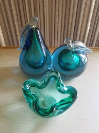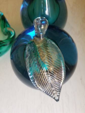 Vintage early 1960's and rare. Murano Italian Art Glass. Beautiful blue and green color. The leaves have gold flecking. The pear measures approx 7.5" tall. The apple measures about 5" tall. The ashtray measures about 5" across (I have never seen a matching ashtray in other posts).