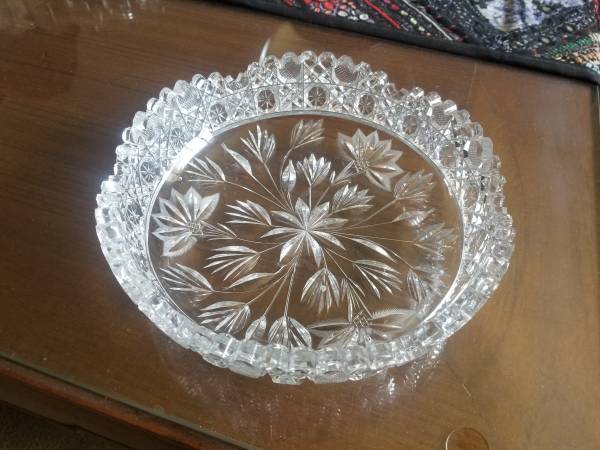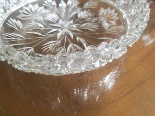 Beautiful Vintage Crystal Bowl, Centerpiece, Coin Dish Small and flat, 8" across Beautiful, detailed pattern Would make a nice gift Prefer email or text messages, no calls I get a ton of spam so,...