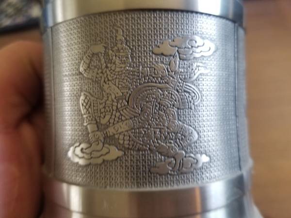 Pewter Mug / Stein From Thailand - Etched Thai Folklore Scenes Vintage barware Approximately 50 years old Height is about 4-1/2" Cup hole is about 3" across Has elephants on it Prefer email or text...