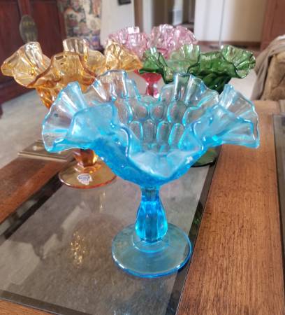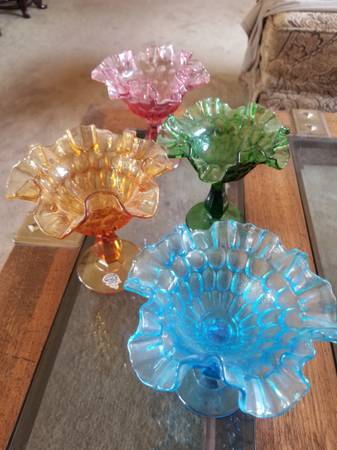 Set of 4 Fenton Ruffled Thumbprint Glass Goblets Each goblet measures approximately 6" tall x 6" across the top. Each are slightly different in size. No chips, cracks or damage that I have seen. The...