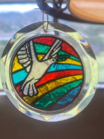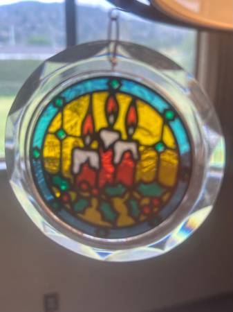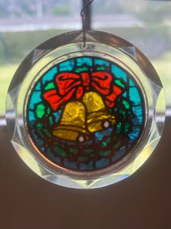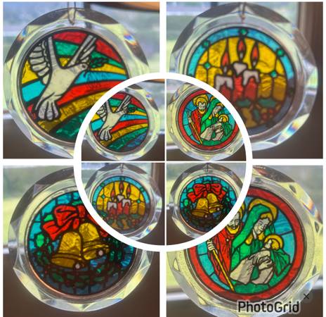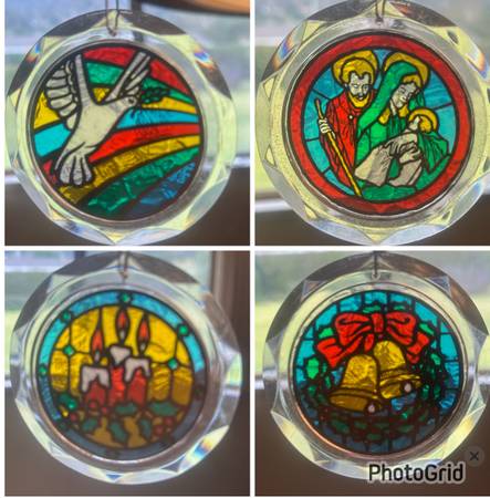 These are approximately 50 years old and made of acrylic resin. They resemble stained glass but are not stained glass. Each piece measures 3-1/4 inches across. They are very pretty when illuminated by Christmas lights behind each one.