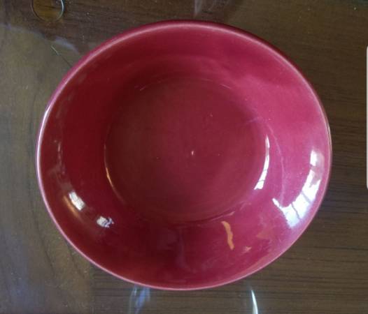 Red in color. The bowl measures about 7-1/2 inches across and 2 inches deep. No chips or cracks,