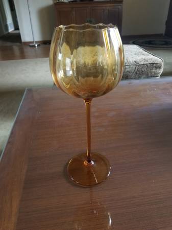 The goblet is 14" tall. The base is 5" across. The goblet is 6" across at its widest point. I've noticed a tiny air bubble in the bottom of the goblet, which is common in hand blown pieces (last photo)