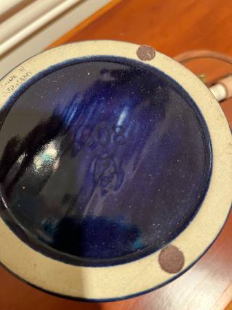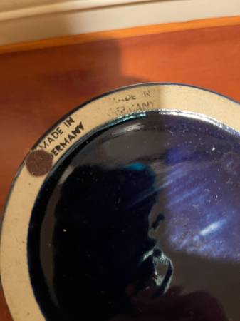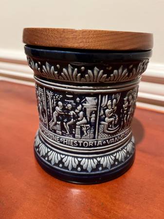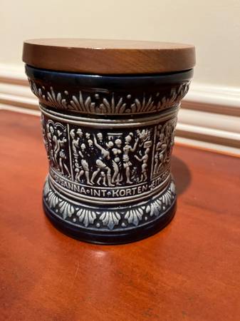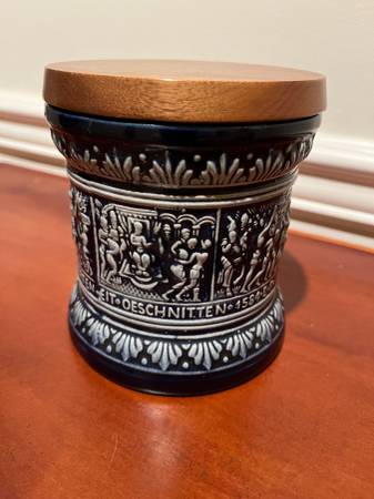 Vintage Tobacco Jar Humidor, blue ceramic with wooden lid. Note that the lid has a dehumidifier insert. Stamped on edge "Made in Germany" by Marzi & Remy. Marked on bottom with Number 608. It Is approximately 5 1/8" Tall X 4.5" Diameter. There are no chips or cracks and it does not smell of tobacco.