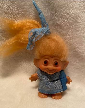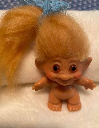 Vintage 60's Uneeda Wishnik Troll, 3 inches tall hard plastic with charming amber-colored eyes and orange hair. Despite showing some age along the back hair line, this collectible is in good...