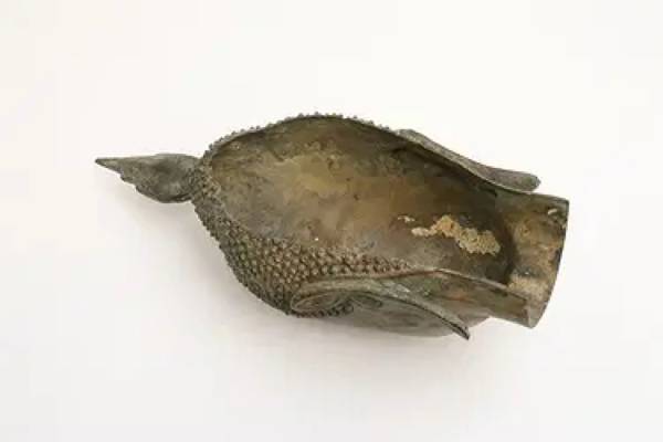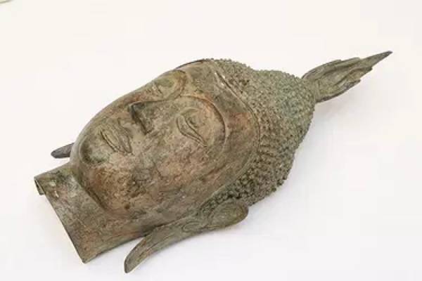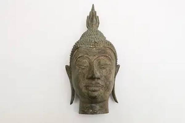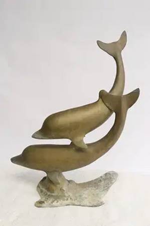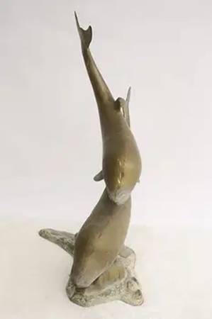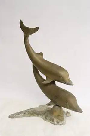 2 pieces; Asian bronze sculpture of deity head (10.3"H), and a brass sculpture of dolphin group (14.2"H) Shipping available