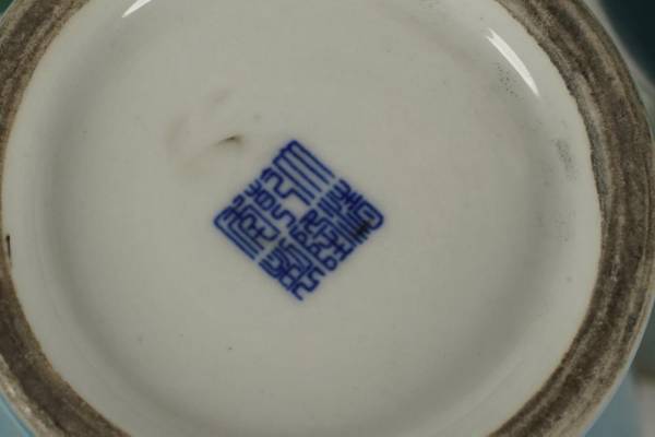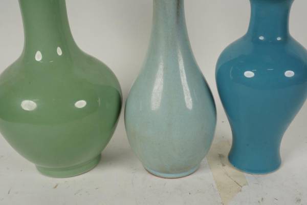 Will sell separately upon request. Shipping available. Three Chinese Monochrome Porcelain Vases the first: in pale blue (12 1/2 in. high); the second: in green (12 1/4 in. high); the third: in azure...