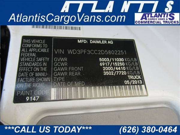 Why buy from Atlantis ? We have Multi-Point Inspection and Goodwill 30 Day Warranty on all our trucks and vans. We have been selling quality trucks and vans since 1990. You are looking at a 2013 Mercedes-Benz Sprinter 3500 Bucket Van 86,961 miles, AM/FM Stereo ,Air Conditioning. Stock: 10660 Vin: WD3PF3CC2D5802251