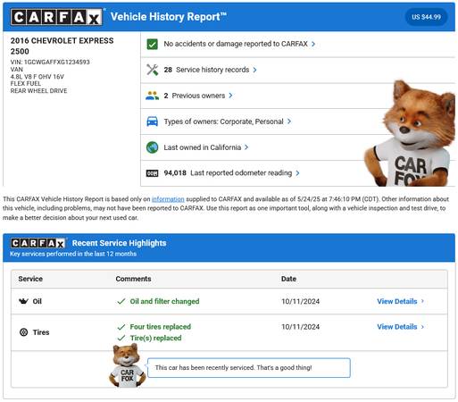 2016 Chevy Express 2500 Cargo Van - Clean title and Carfax - only 94K Miles - 4.8 V8 Engine - Automatic transmission - Keyless Entry - Back up Camera - Cruise Control - Traction control - Power locks - Power windows - Bluetooth - XM Radio - On star - USB - Aux - Wheel Controls - Power outlet - Divider from Cargo area - - Tires like New - Comes with a Free 90 Days or 3000 Miles Warranty! Price: $15900. Financing Available - Trade ins Welcome. Located in Rosemead Ca 91770. Contact me if you like to see it at (51O)461-3O41.