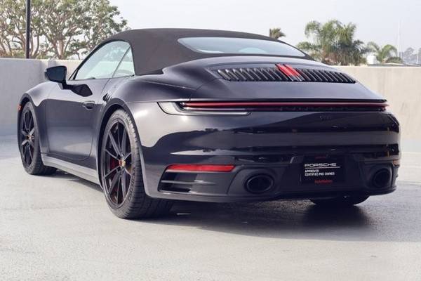 * Bordeaux Red/Black; Leather Seat Trim W/Two-Tone Leather Interior * Leather Seats * Navigation System * Keyless Start * Rear Spoiler * Convertible Soft Top * BlackThis vehicle includes a Money-Back Guarantee* and passed our precise inspection process. Best of all the price you see is the price you pay. No haggling. No back and forth. No pressure. And this price is so good it is guaranteed. *Money-Back Guarantee is valid for 5 days or 250 miles, whichever comes first. Subject to certain terms and conditions. See store for details. Some restrictions apply.2023 Porsche 911 Carrera S Cabriolet (992) 6,735 Miles , Jet Black Metallic , Black / Bordeaux Red Leather , PDK Offered for sale is this stunning and meticulously optioned 2023 Porsche 911 Carrera S Cabriolet , finished in Jet Black Metallic over a dramatic Black and Bordeaux Red leather interior , topped with a black cabriolet roof . With only 6,735 original miles , this example presents in near-new condition and showcases one of the most desirable configurations available for the 992-generation 911. This Carrera S Cabriolet combines open-top driving with serious performance hardware, advanced chassis technology, and luxury-focused optionsmaking it equally suited for spirited driving and refined cruising. Performance & Chassis Highlights 3.0L Twin-Turbo Flat-Six paired with PDK Dual-Clutch Transmission Sport Package PASM Sport Suspension (lowered 10mm) Sport Chrono Package Sport Exhaust System with Black Tailpipes Porsche Dynamic Chassis Control (PDCC) Rear Axle Steering Front Axle Lift System Extended Range Fuel Tank (23.7 gallons) Exterior & Design Jet Black Metallic Exterior Wheels Painted in Jet Black Metallic Exterior Mirror Bases in Exterior Color PORSCHE Rear Logo in High Gloss Black 911 Rear Script in Exterior Color Preparation for Deletion of Model Designation Black Cabriolet Roof Interior & Comfort Leather Interior in Black / Bordeaux Red 14-Way Power Sport Seats with Memory Ventilated Front Seats GT Sport Steering Wheel in Leather Ambient Interior Lighting Storage Package Seat Belts in Chalk Porsche Crest on Front Headrests BOSE Surround Sound System Technology & Driver Assistance Premium Package Porsche Dynamic Light System Plus (PDLS+) Surround View Camera System Lane Change Assist (LCA) Power Folding Exterior Mirrors This 911 Carrera S Cabriolet delivers a rare combination of exhilarating performance, cutting-edge chassis technology, and open-air luxury. Its low mileage, exceptional option listincluding PDCC, rear-axle steering, and front-axle liftand striking color combination make it a standout example among 992-generation Carreras. A truly exceptional 911engineered for purists, styled for impact, and ready to be driven.
