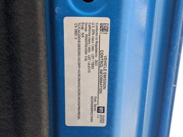 * Engine; Duramax 3.0L Turbo-Diesel I6 * Navigation System * Glacier Blue Metallic * Lpo; Dark Essentials Package * Engine Block Heater * Lane Keeping Assist * Keyless Start * Audio System; Chevrolet Infotainment 3 Premium System * Emissions; California State Requirements * Gvwr; 7000 Lbs. (3175 Kg) * Jet Black; Cloth Seat Trim * License Plate Kit; Front * Lpo; Black Nameplates * Lpo; Black Tailgate Lettering * Rear Axle; 3.23 Ratio * Rst Preferred Equipment Group * Seats; Front 40/20/40 Split-Bench * Tire; Spare 265/70R17Sl All-Season; Blackwall * Tires; 265/65R18Sl All-Season; Blackwall * Transmission; 10-Speed Automatic; Electronically Controlled * Wheels; 18" X 8.5" (45.7 Cm X 21.6 Cm) Bright Silver Painted Aluminum * Not Equipped With Steering Column Lock; See Dealer For DetailsThis vehicle includes a Money-Back Guarantee* and passed our precise inspection process. Best of all the price you see is the price you pay. No haggling. No back and forth. No pressure. And this price is so good it is guaranteed. *Money-Back Guarantee is valid for 5 days or 250 miles, whichever comes first. Subject to certain terms and conditions. See store for details. Some restrictions apply.