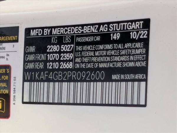 * Sun/Moonroof * Body Color Rear Spoiler * SiriusXM Satellite Radio * Natural Grain Black Wood W/Aluminum Lines Trim * Wheel Locking Bolts * Keyless Start * Rear Spoiler * First Aid Kit * Black; Mb-Tex Upholstery * Crystal Grey Fabric Headliner * Polar White * Wheels: 18" MultispokeThis vehicle includes a Money-Back Guarantee* and passed our precise inspection process. Best of all the price you see is the price you pay. No haggling. No back and forth. No pressure. And this price is so good it is guaranteed. *Money-Back Guarantee is valid for 5 days or 250 miles, whichever comes first. Subject to certain terms and conditions. See store for details. Some restrictions apply.Thank you for visiting another one of Mercedes-Benz of South Bay's online listings! Please continue for more information on this 2023 Mercedes-Benz C-Class C 300 with 12,291mi. Pull up in the vehicle and the valet will want to parked on the front row. This Mercedes-Benz C-Class C 300 is the vehicle others dream to own. Don't miss your chance to make it your new ride. The impressive Mercedes-Benz fuel-efficiency will make you quickly realize what you've been missing out on in life. It's noteworthy fuel economy and minimal emissions make this vehicle's value a cut above the rest. It's not often you find just the vehicle you are looking for AND with low mileage. This is your chance to take home a pre-owned and barely driven Mercedes-Benz C-Class. The look is unmistakably Mercedes-Benz, the smooth contours and cutting-edge technology of this Mercedes-Benz C-Class C 300 will definitely turn heads.
