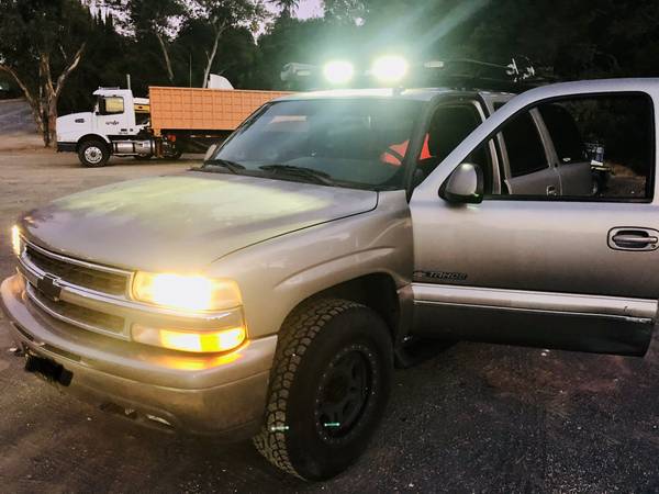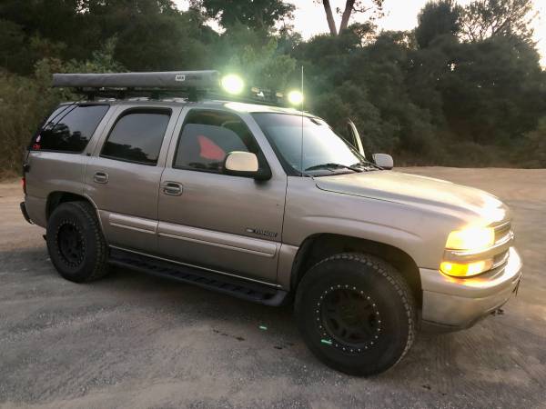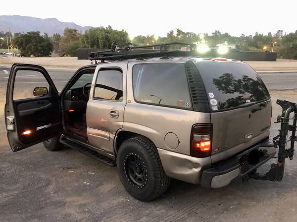 2002 Chevy Tahoe with 256k miles. V8 / 4WD, always mechanically well maintained, engine runs clean and strong. Upgraded stereo head unit (BT, SiriusXM ready, Touchscreen), amplifier, CB radio w/ Firestick Antenna, Roof Rack with lights (front and back), Dual battery system, large lock box (key needed), seat covers, 17" Pro Comp Wheels w/ Hankook 285 All-Terrain Tires, Yakima Bike rack. Truck has dent on driver's side passenger door but it does NOT affect door or window operation, ARB Dual air compressor (switch not working).